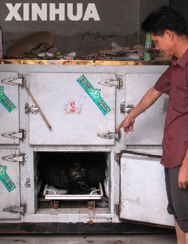 | 找到的第一具遇难矿工遗体被安放在兴宁殡仪馆内(8月10日摄)。8月10日凌晨,从兴宁矿难现场打捞出一具矿工遗体。 |
