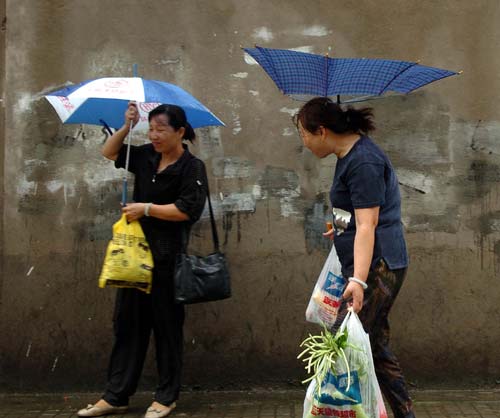 | 9月1日,福州市两位市民艰难地撑着雨伞。 |