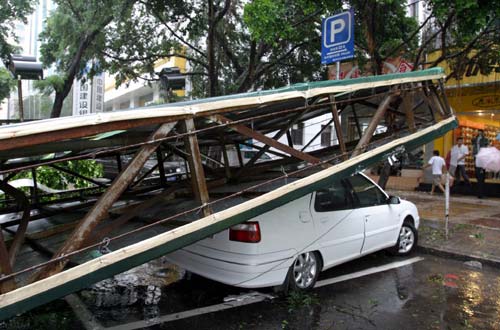 | 9月1日,福州市东街口被风吹倒的广告牌压在一辆轿车上。 |
