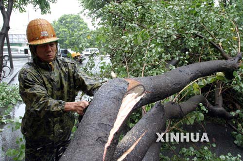 | 9月1日,福州一位园林工人正在处理被大风刮断的树木。 |
