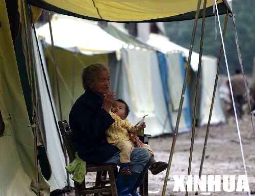 9月5日,安徽金寨县一位老人带着孙子坐在临时帐篷前。新华社记者舒继华摄