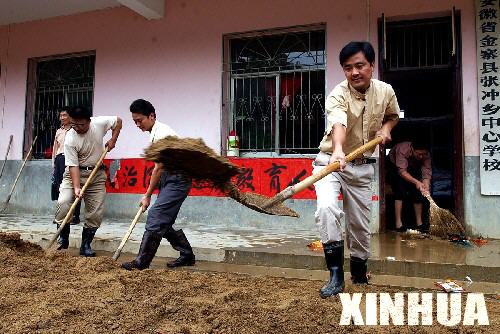 9月5日,安徽省金寨县张冲乡中心学校教师正在清理教学楼外的淤泥。新华社记者舒继华摄