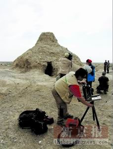 目前考察队已进入米兰古城,随后将考察楼兰遗址,探访佛教遗迹。本图片是考察队在考察孔雀河沿线营盘遗址中的佛塔遗迹。