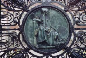 我站在国际法庭门前已经是夕阳西下时分,两扇欧氏雕栏铁门紧闭,每扇门的左右两侧上都有一个圆盘,上面雕着的庄严的神像,和手举橄榄枝的女神……,四个浮雕都各不相同,而法庭的公平的准则和其威严的形式在那浮雕上就可以看到了。