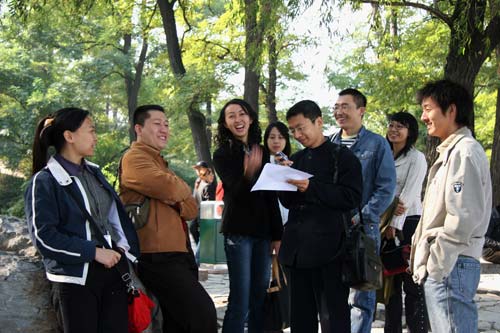 编者按:2005年10月21日,参加“体验之旅”四人组合选拔赛的12名网友齐聚北京。他们在体验激烈残酷比赛的同时,更感受了来自互补相识人的珍贵友谊。在演播室外,大家嬉笑搞怪、开怀畅谈、好不开心!相信在央视网站拍摄、生活的这几天,给每个人都留下了许多美好而难忘的回忆。下面是网友荣浪提供的照片,真实的记录了他们赛外的精彩生活!