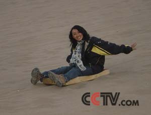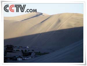 立在沙顶能够“一览众山小”时那番爽快,尤其是在远望到沙山背后敦煌市区的郁郁葱葱时得到升华。太阳的西斜赶着我们的脚步,要将沙山浓浓的影遮向月牙泉,我们也做着最后的努力,去追赶温暖的阳光。滑下沙坡的感受无以言表,一股细腻顺着裤筒、脚腕钻进来。起初还为搞乱了这片沙坡而感到惭愧,可是玩兴大起的我们,后来就顾不得这些了,身后落下的长长的“尾巴”如同沙山上的一道划痕,也许今夜的一阵风就会让它愈合。而月牙泉的伤痛呢?谁能排遣它的忧郁?
