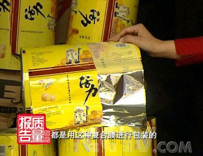记者现场:这些就是佳鹏食品厂用来生产薯片的包装膜,质监人员告诉我们,这种膜其实是有三层粘合而成的,因此它叫做复合膜,在我们国家目前很多食品都是用这种复合膜进行包装的,那么在这么薄的薄膜当中,怎么会出现有毒的苯呢?