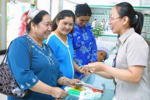 图为该集团中心医院中心药厅的工作人员在向维吾尔族妇女马罕(前左)讲解药品服用方法。(王新彪 )