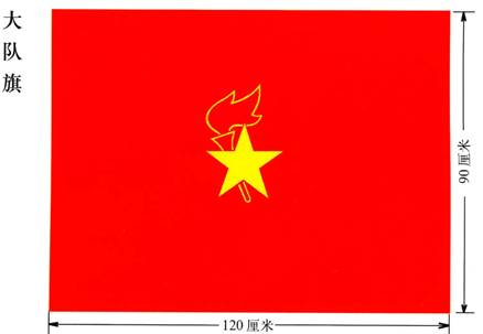大队旗,高为90厘米,长为120厘米,旗中心有黄色五角星及火炬(火炬镶黄色边,内为红色)。可用布、绸、缎或其他质的材料制做。