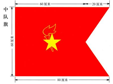 中队旗,高为60厘米,长为80厘米,一端剪去高为20厘米、底宽为60厘米的等腰三角形,形成一个三角缺口。五角星及火炬(颜色同大队旗)在以60厘米为边长的正方形中心。可用布、绸、缎或其他质的材料制做。