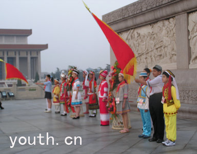 6月1日凌晨,全体少代会代表汇聚天安门广场,参加庄严的升国旗仪式。在绯红的朝霞中,少先队员代表们来到雄伟的人民英雄纪念碑前,怀着崇敬的心情瞻仰了纪念碑。伴随着《少先队员之歌》的歌声,24名少先队员高擎8面星星火炬队旗,在人民英雄纪念碑前站少年先锋岗。(记者郑敬夫 钟志敏 摄)