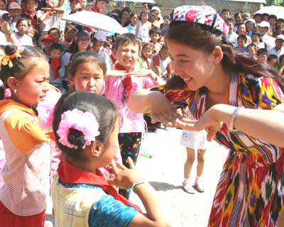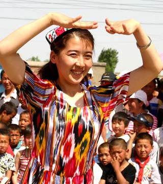 6月1日,西北第二民族学院法律系学生胡尔西旦在银川市西夏区便民小学为孩子们表演民族舞蹈。当天,西北第二民族学院的青年志愿者来到专门服务于农民工子弟的银川市西夏区便民小学,和孩子们共度“六一”。 新华社发(张万静摄)