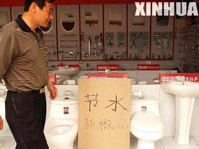 6月19日,一位顾客在北京八里桥建材市场挑选节水卫浴器具。节水器具正成为北京市民的新宠。据介绍,用节水马桶一次可节约用水4至5升。 北京是世界上严重缺水的大城市之一,已连续5年干旱,人均可利用淡水资源仅为300立方米,是全国人均的1/8、世界人均的1/30,不仅达不到人均3000立方米的一般缺水标准,甚至大大低于人均1000立方米的重度缺水标准,水资源形势严峻。