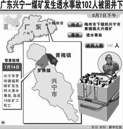 经过23天的昼夜抢救,广东兴宁市大兴煤矿特大透水事故抢险救援指挥部今天下午宣布,鉴于井下不具备生存条件,救援难度大,根据从事生命科学研究的有关专家对井下被困矿工的生存环境、生存可能等问题进行认真分析研究后认为,截止到8月23号,井下矿工仍在矿井内水面以下,已不具备生命存活的条件。
