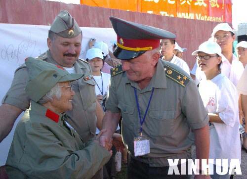9月2日,为纪念中国人民抗日战争暨世界反法西斯战争胜利60周年,世界二战老兵《北京和平宣言》签署暨《北京和平墙》揭幕仪式在北京朝阳公园举行。这是两位乌克兰军队代表在向中国东北抗联老战士问候。 新华社记者 何俊昌 摄