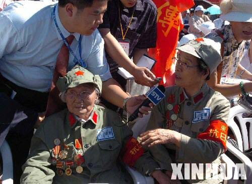9月2日,为纪念中国人民抗日战争暨世界反法西斯战争胜利60周年,世界二战老兵《北京和平宣言》签署暨《北京和平墙》揭幕仪式在北京朝阳公园举行。这是中国老兵接受记者采访。 新华社记者 陈树根 摄