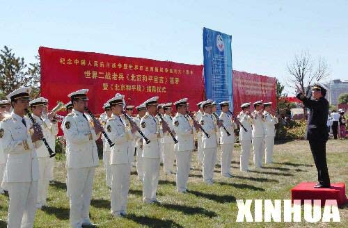 9月2日,为纪念中国人民抗日战争暨世界反法西斯战争胜利60周年,世界二战老兵《北京和平宣言》签署暨《北京和平墙》揭幕仪式在北京朝阳公园举行。 新华社记者 陈树根 摄