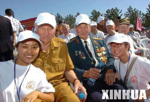 这是两位少女和二战老战士合影留念。 新华社记者 何俊昌 摄