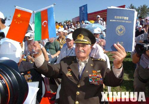 这是一位二战老兵手举《北京和平宣言》。 新华社记者 何俊昌 摄
