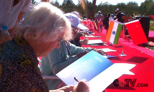 9月2日,为纪念中国人民抗日战争暨世界反法西斯战争胜利60周年,世界二战老兵《北京和平宣言》签署暨《北京和平墙》揭幕仪式在北京朝阳公园举行。 央视国际记者 王丽华 摄