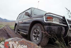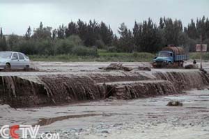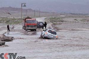 从新疆喀什出城不久,遭遇雨后“小瀑布”,车轮脱离路面,车陷洪水 |