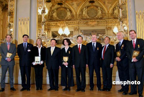 中新社巴黎十二月六日电 (记者 钟诚)六位法国人五日获得中国政府颁发的“中外文化交流贡献奖”,他们高兴地称其为“中国勋章”。十二月五日,由中国文化部部长孙家正主持的颁奖仪式在巴黎奥赛博物馆举行,正在此间进行正式访问的中国总理温家宝出席了颁奖仪式。