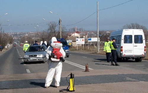 | 2月20日,在罗马尼亚东部康斯坦察县的图兹拉村,康斯坦察县卫生防疫人员正准备为经过欧洲第39号公路的车辆消毒。新华社发(罗新社照片) |