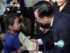 程思涵小朋友把自己获得的“繁星杯全国少儿书画一等奖”的奖状拿给总理看。孩子们还把自己的美术作品送给温家宝。