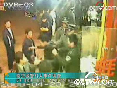 在南京市一家炭烤生蚝店,城管人员让店主将摆在店门口的桌子和玻璃柜搬进店内时,正在这里吃夜宵的两市民过来围观,并在讽刺城管“你们真牛”的同时还竖起大拇指。 巧的是,这家小店于几天前刚安装了4个监控摄像头。根据录像资料显示,就在这两人对城管爆粗口后不久,已经离开的城管又折回来。这两人还没弄清怎么回事,就被人从座位上揪了起来,接着就是一顿暴打。