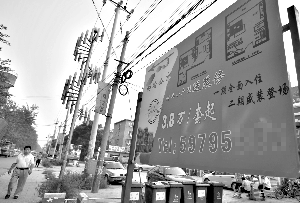 昨日下午,大兴区西红门镇四村路边广告牌上写着约翰公寓二期开盘。本报记者 孙纯霞 摄