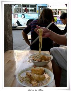 然而如果仅仅如此,那还不足于体现沙茶面的魅力,最后一道叫“加料”的程序可谓画龙点睛。随客喜好,加什么料,全由自选,有炸豆腐、米血、大肠、腰花、鸭肠,不一而足。我最喜欢油炸豆腐,外焦里嫩,就着劲道的面条,还有脆爽可口的鸭腱,再浇上一小勺辣油,便可在大快朵颐中一享痛快淋漓的饕餮。