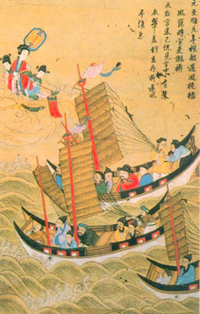 妈祖十六岁时,与群女闲游,照妆于井中。忽见神人捧铜符一双,拥井而上,后有仙班簇拥着,把铜符授给她,女伴们都骇得跑开,妈祖则受之不疑,不一会便灵通变化。此后,她虽身在室中,却能时常神游方外,谈吉凶祸福,无不奇中。能驾云飞渡大海,拯救海难,还经常为人治病消灾,远近的人都很感激她,并称她为“神姑”、“龙女”。