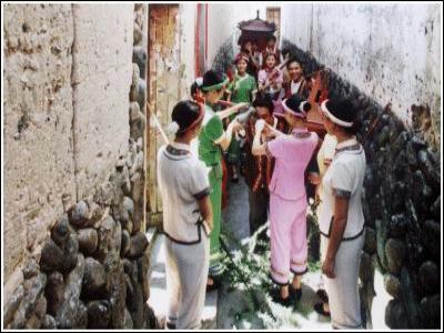 相亲:畲族通婚的形式是用对山歌,但还要互换条件,茶铺钟姓通婚的村庄是漳平的雷姓、华安仙都的蓝姓。在每年的正月初,三姓中都选出可婚的男女青年同样多,到对方的村子里去。由老一辈带队,人数男女相等。男的二十岁,女的十八岁,如果不足数,也要挑出不足数来补足。然后按对歌对答,答对了,则表示满意,可以订亲,不够年龄女青年而又答中者,规定先娶到男家当妹妹,到年龄后才许成亲;在当妹妹时,谁也不能违规,违规者取消婚约。此俗已废。