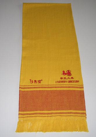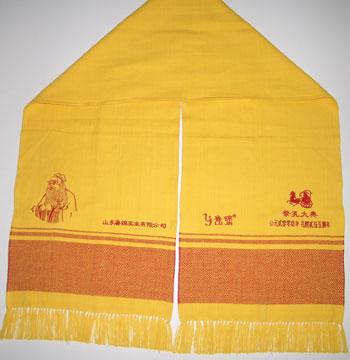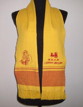 在今年的国际孔子文化节上,各位来宾将身着鲁锦祀孔绶带参加祭孔大典。该绶带色彩艳丽,质地优良,寓意深刻。黄色代表孔圣人的尊贵至高无上,红色代表亿万尊孔祀孔人的火热赤情,飘逸的流苏表示儒家文化万古流芳。孔子标准像以红色绣出,具有极强的感召力和冲击力。红色的车马图代表了孔子一生的丰功伟绩,具有较强的收藏和实用价值。