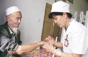 功夫不负有心人。刘玉莲的医术在十里八村出了名。二村的、四村的、七村的……拱拜湾的村卫生所里,从早到晚坐满了病人。 村民玉素甫·买买提患支气管哮喘多年,脖子上还有一个硕大的甲状腺瘤。到城里多家医院求医问药,不见好转。刘玉莲用针灸疗法结合药物治疗,两个月后,玉素甫·买买提的支气管哮喘不犯了,脖子上的“大疙瘩”也慢慢消失了。老人逢人便伸出大拇指说:“丫头罕,医术好得很!” “丫头罕,医术好,人更好。”这是乡亲们对刘玉莲的又一评价。
