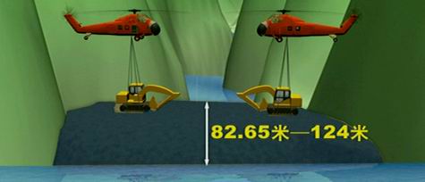 5月26日,央视网记者乘直升机从绵阳市飞往北川县唐家山堰塞湖,亲历唐家山堰塞湖抢险过程。 左上图:刚到堰塞湖的时候,这里还没有机械,全凭战士们用双手清理出一块块平地用来停放空运来的装备。 左下图:几名专家乘机来到现场察看地形,布置排险方案。