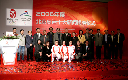 经过网民投票和专家评审,“2006年度北京奥运十大新闻”是:“中国政府高度重视奥运筹办工作”,“北京奥运会门票价格确定,定价等于或低于100元的票数占58%”,“‘鸟巢’钢结构完成卸载,场馆建设取得重大进展”,“北京地区24万人报名加入奥运会志愿者队伍”,“北京奥组委启动‘同心结’交流活动”,“国际奥委会确定北京奥运会竞赛日程”,“张艺谋等加盟北京奥运会开闭幕式团队”,“‘福牛乐乐’完美诠释北京残奥会‘超越、融合、共享’理念”,“2008年奥运会体育图标发布”,“《北京奥运会及其筹备期间外国记者在华采访规定》颁布”。