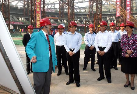 | 胡锦涛在国家体育场工地听取工程建设情况介绍 新华社记者樊如钧摄 |
