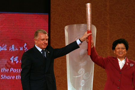 刘淇指出,北京奥运会的火炬设计,既具有鲜明中国文化特色的造型外观,又包含着精湛的材料工艺技术。它将承载着中国人民对世界各国人民的友好情谊,承载着奥林匹克精神走遍五大洲,并登上世界之巅。