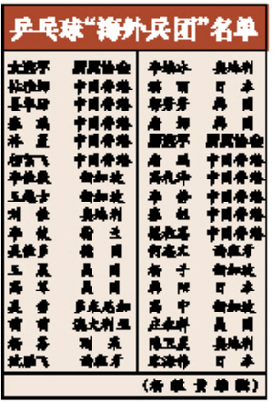 16名来自不同国家与地区的运动员参加乒乓球女子世界杯,其中13名是中国人。这种现象,是正常还是不正常?国际乒联主席沙拉拉昨天在广州透露,国际乒联将在广州世乒赛期间召开全体代表大会,以投票的方式表决是否对越来越突出的“海外兵团”现象实施严厉的打压措施,也就是对于运动员代表其他国家与地区比赛作出更明确的条文限制。他重申,这样做并不止是针对中国,还包括罗马尼亚等国家和地区。但是,此举一旦生效,将很大程度上让过盛的“海外兵团”成为历史名词。