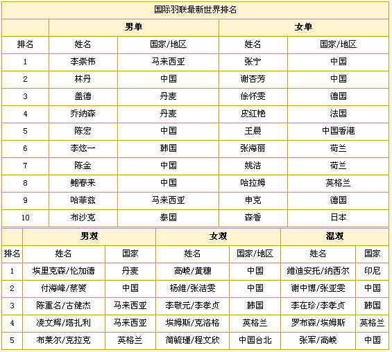 搜狐体育讯:北京时间6月30日,国际羽联公布了最新一期的世界排名。马来西亚选手李崇伟和中国奥运会冠军张宁分列男女单榜首。中国羽坛情侣林丹和谢杏芳则占据了男女单打第二名的位置。双打方面,丹麦组合埃里克森/伦加德重新夺回了男双第一的宝座,中国组合付海峰/蔡赟位列第二;中国两对组合高崚/黄穗和杨维/张洁雯则包揽了女双前两名的位置;印尼混双组合维迪安托/纳西尔排名第一,中国组合谢中博/张亚雯和张军/高崚分列第二和第五位。下面是各项具体排名情况: