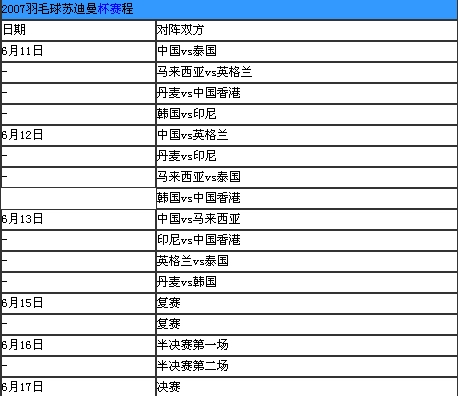 TOM体育讯 2007年苏迪曼杯羽毛球团体赛赛事赛程日前公布,今年的苏迪曼杯将于北京时间6月11日在苏格兰格拉斯哥举行,中国队首场比赛的对手是泰国队。