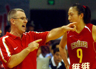 洛阳,2006年7月5日,在2006年四国女篮挑战赛洛阳站第二轮的比赛中,中国队以74比80负于捷克队。中国队主教练马赫(左)在场边为队员布置战术。新华社记者王颂摄
