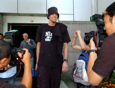 | 昨天,参加2006斯坦科维奇洲际篮球冠军赛的德国男篮抵达南京,图为诺维茨基走出机场。 新华社发 |
