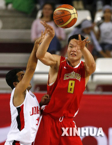 | 12月13日,中国队球员朱芳雨(右)在比赛中分球。当日,中国队在多哈亚运会男子篮球半决赛中以86比58战胜约旦队,进入决赛。 新华社记者王丽莉摄 |