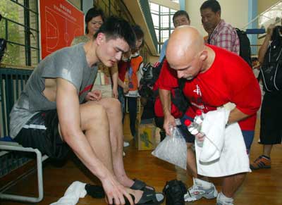 | 训练过后,大卫·马卡赫为姚明检查伤口 |