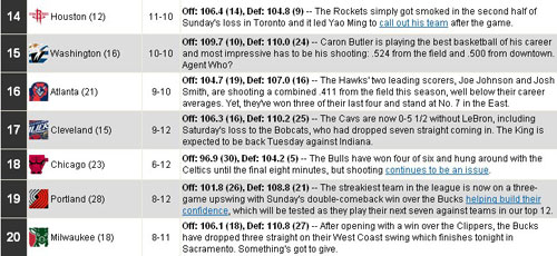 14.火箭(12),11胜10负——昨天输给猛龙的比赛火箭整个下半时形同梦游,赛后姚明怒不可遏,声称这是他职业生涯最糟糕的比赛。