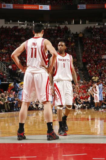 (图1:5月8日,姚明与麦蒂在与爵士的比赛中)
