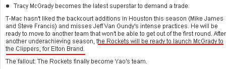 特雷西-麦格雷迪将会是最后一个要求被交易的超级巨星,他显然不喜欢今年回归后场球员的史蒂夫-弗朗西斯跟麦克-詹姆斯。在杰夫-范甘迪被炒掉以后,他不太适应现在主教练阿德尔曼的进攻方式,他将会被要求交换到另一个球队,来破掉自己头上不过季后赛首轮的魔咒。再次经历一个命途多舛的赛季,火箭将会用麦蒂作为筹码跟快船进行交易,换来他们的现任船长布兰德,这样火箭将会组成以姚明为核心的球队,姚明将会变身火箭队的老大,在布兰德的辅助下真正成为西部强队。