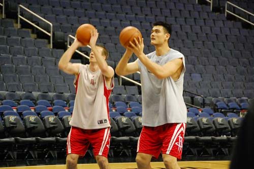 图文:[NBA]火箭VS奇才训练图 姚明与诺瓦克训练